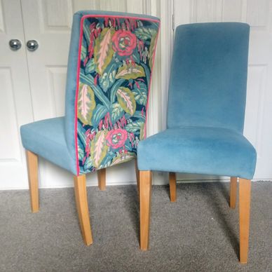 Ann ordered six dining chairs with Romo Atil hardwearing seats and Linwood Omega printed velvet feature backs. A full rebuild with sprung seats for extra comfort