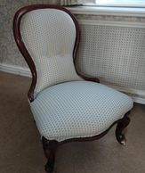 Brought to us as a bare frame, we refinished the woodwork and used traditional techniques to upholster the seat, covering with a lovely fabric supplied by the customer