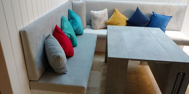 Dominic from Leamington Spa was delighted with the advice and help we gave him with this custom made kitchen seating area which we finished for him in grey velvet.