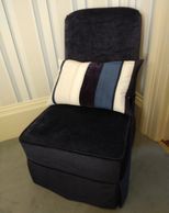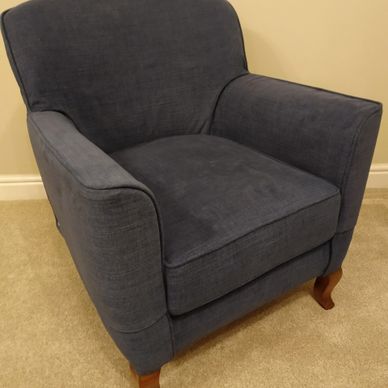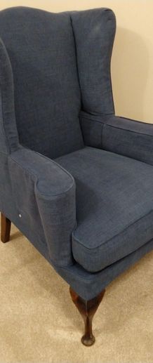 A well fitted loose cover with skirt transformed this occasional chair to match Mark and Jane's blue decor