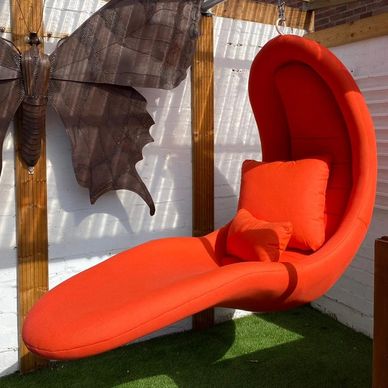 Becky of Harbury was over the moon with this refurbishment of an unusual hanging seat which she inherited from her father. An piece using Sunbrella outdoor fabric