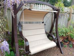 Lucy and Mick of Kenilworth commissioned us to make a new custom seat and canopy for this restored garden hanging seat done in waterproof outdoor fabric