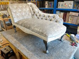 This daring chaise lounge was completed in a deep silver J Brown Moderna velvet and buttoned using large diamante buttons. Job completed with new pewter silver legs
