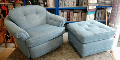Jane of Leamington was very pleased with our work on her beloved American made arm chair and stool finished in Warwick Homespun fabric