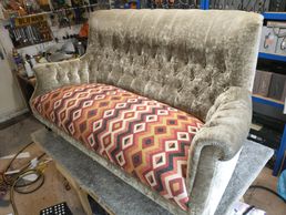 Lucy and Mick of Kenilworth were delighted with this frame up rebuild of a delightful family heir loom. Finished in gold velvet with blue buttons and matching double piping.