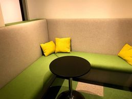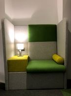 Ian was pleased that we fulfilled his vision for his office development . Pictured is "The Snug" at "Meet by the Park" in Leamington Spa created using high end, hard wearing Romo pure wool fabric