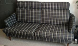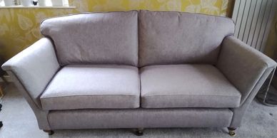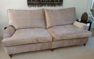 This very well build Duresta sofa came originally with bright red velvet which didn't match Gill and Rod's décor. We toned it down with a more subtle Warwick Homespun fabric