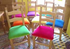 Natasha hated the original covers on these seats so we offered her a funky animal print which matched the colour of the wood and brought the chairs up to date