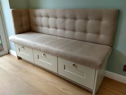 Nick and Gill from Wellesbourne were happy to take our advice on the design of this faux suede kitchen seating with matching dining chairs which we upholstered and installed